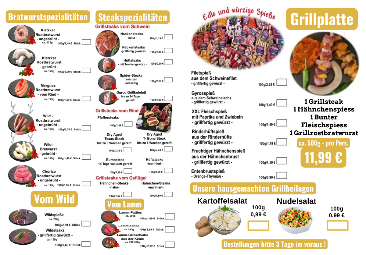 Wir haben für Sie eine Auswahl unserer Grillspezialitäten zusammengestellt, die Sie mit dem folgenden Flyer gern bei uns vorbestellen können!